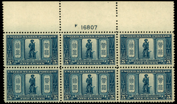 7341 nhbl 619 image1925, 5¢ Lexington-Concord (Scott 619), plate block of 6, o.g., never hinged, Extremely Fine.
