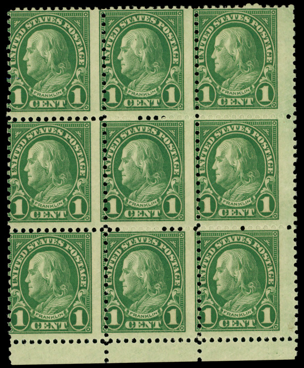 7352 nhbl 632 image1927, 1¢ Franklin, rotary press printing (Scott 632), block of 9, vertical perf shifts, o.g., never hinged, Fine. (Image) Suggested Bid $50