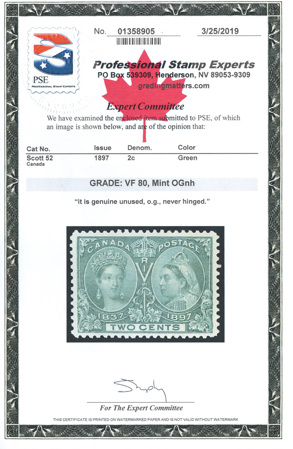 8400 nh 52 image1897, Queen Victoria Jubilee, 2¢ green (Scott 52), o.g., never hinged, fresh and nicely centered, Very Fine, with a 2019 P.S.E. certificate graded VF 80.
