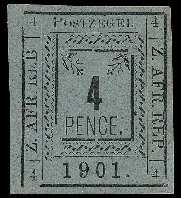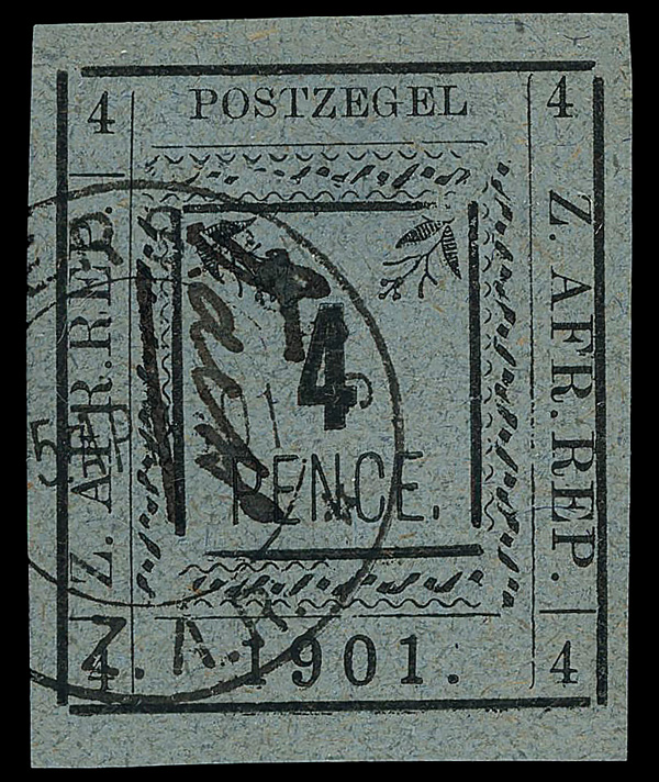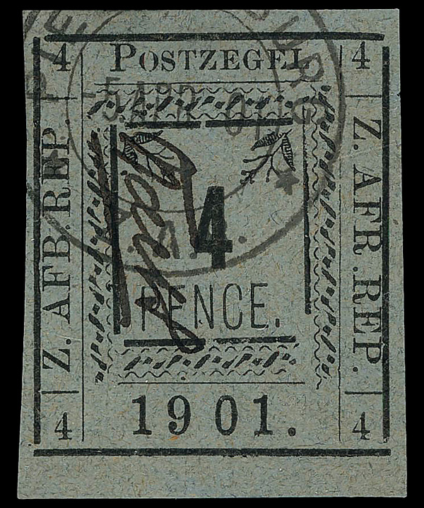 8388 O 186 var. image1901, 4d black on dull blue, Pietersburg Issue, no line under UR '4' (Scott 186 var.), cancelled to order, Very Fine to Extremely Fine.