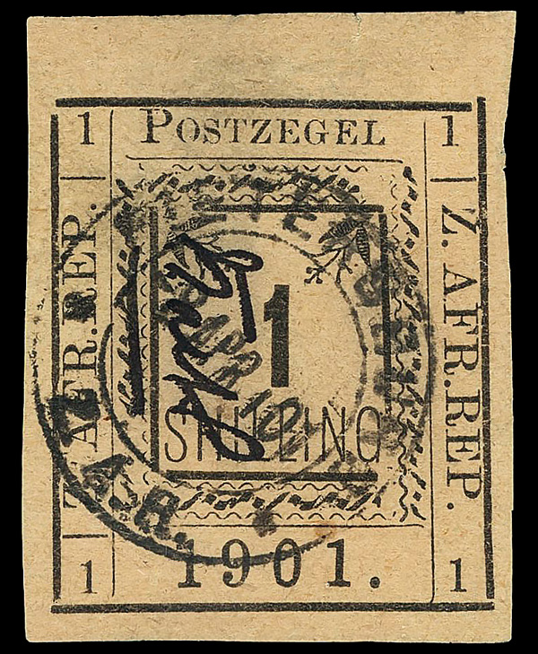 8389 O 190 var. image1901, 1sh black on yellow, Pietersburg Issue, no line above LR '1' (Scott 190 var.), cancelled to order, Very Fine to Extremely Fine.