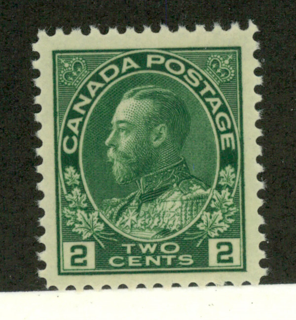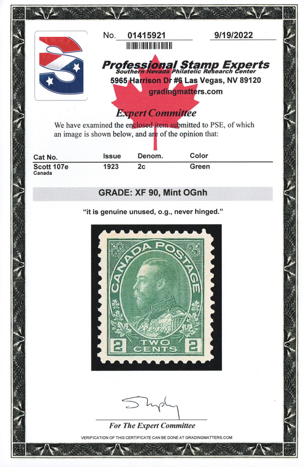 8418 nh 107e image1923, King George V "Admiral", 2¢ green, dry printing (Scott 107e), o.g., never hinged, wonderfully fresh and perfectly centered, Extremely Fine, witha 2022 P.S.E. certificate graded XF 90.