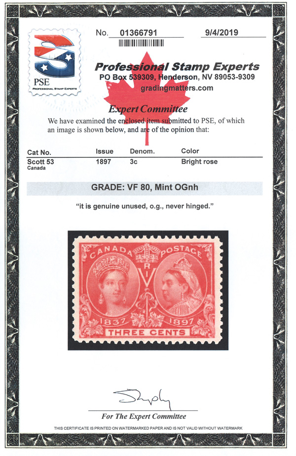 8403 nh 53 image1897, Queen Victoria Jubilee, 3¢ bright rose (Scott 53), o.g., never hinged, bright, fresh and well centered, Very Fine, with a 2019 P.S.E. certificate graded VF 80.