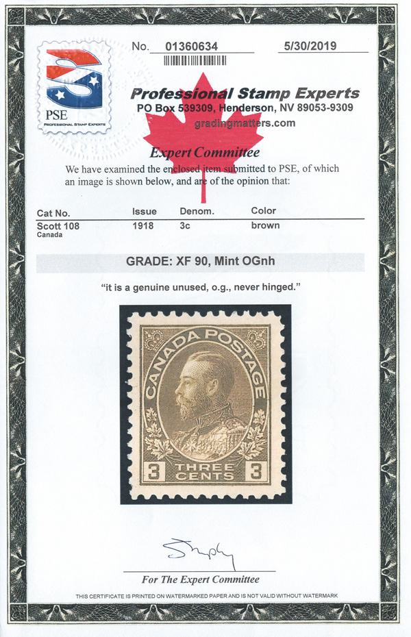 8419 nh 108 image1918, King George V "Admiral", 3¢ brown, wet printing (Scott 108), a pristine mint single, o.g., never hinged, exceptionally fresh with generous, beautifully balanced margins, Extremely Fine, with a 2019 P.S.E. certificate graded XF 90.