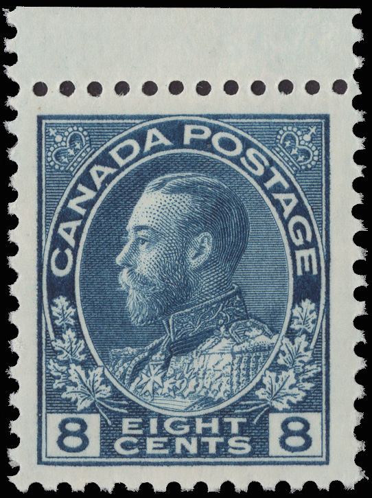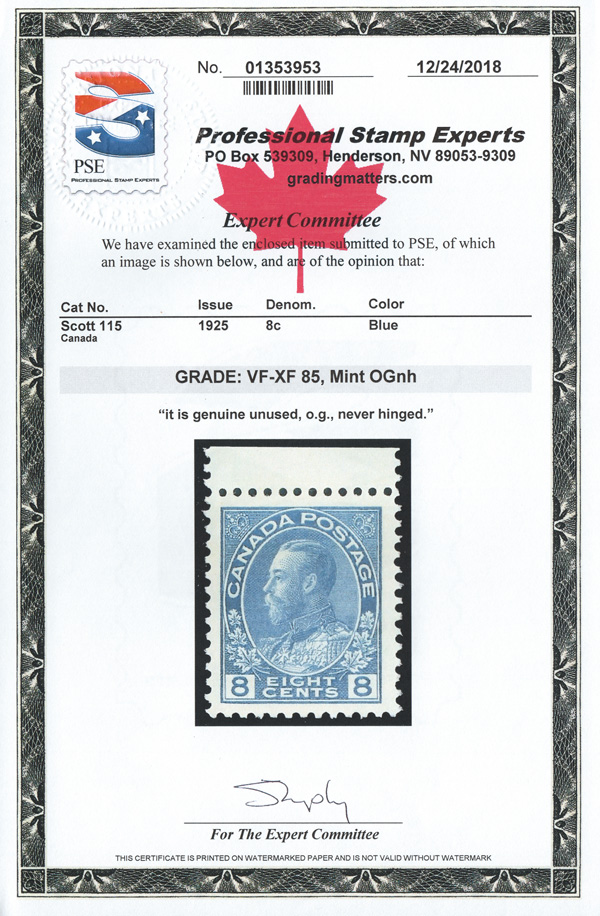 8424 nh 115 image1925, King George V "Admiral", 8¢ blue (Scott 115), top sheet margin single, o.g., never hinged, fresh and well centered, Very Fine to Extremely Fine, with a 2018 P.S.E. certificate graded VF-XF 85.
