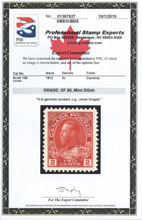 8416 nh 106 image1912, King George V "Admiral", 2¢ carmine (Scott 106), an outstanding mint single, o.g., never hinged, wonderfully fresh and virtually perfectly centered, Extremely Fine, with a 2019 P.S.E. certificate graded XF 90.
