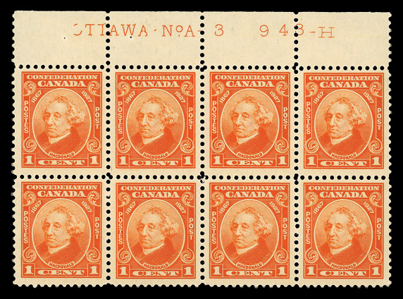 8430 nhbl 141 image1927, 1¢ Confederation (Scott 141), plate block of 8, o.g., never hinged, Very Fine to Extremely Fine.