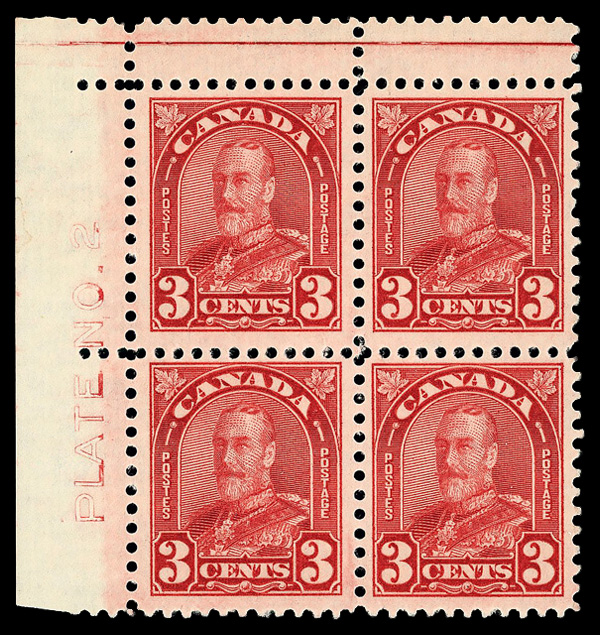 8439 nhbl 167 image1931, King George V "Maple Leaf", 3¢ deep red (Scott 167), UL plate block of 4 plate #2, o.g., never hinged, Very Fine to Extremely Fine.