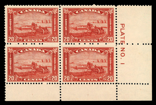 8443 nhbl 175 image1930, 20¢ Harvesting Wheat (Scott 175), plate block of 4, o.g., never hinged, Fine to Very Fine.