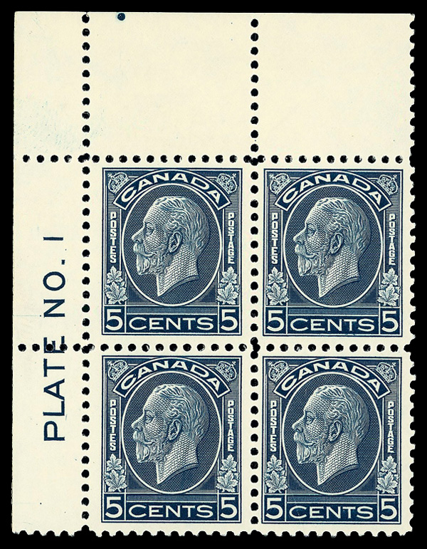 8449 nhbl 199 image1932, King George V "Medallion", 5¢ dark blue (Scott 199), plate block of 4, o.g., never hinged, Very Fine to Extremely Fine.