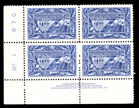 8459 nhbl 302 image1951, $1 Fisheries (Scott 302), plate block of 4, o.g., never hinged, Superb.