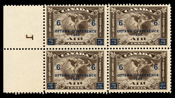 8467 ogbl C4 imageAirmail, 1932, Ottawa Conference, 6¢ on 5¢ olive brown (Scott C4), left margin block of 4 with reverse plate number 1, o.g., hinge remnant, Fine to Very Fine.