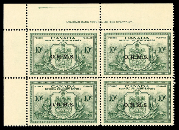 8472 nhbl EO1 imageSpecial Delivery Official, 1950, 10¢ green, "O.H.M.S." (Scott EO1), plate block of 4, o.g., never hinged, Very Fine.