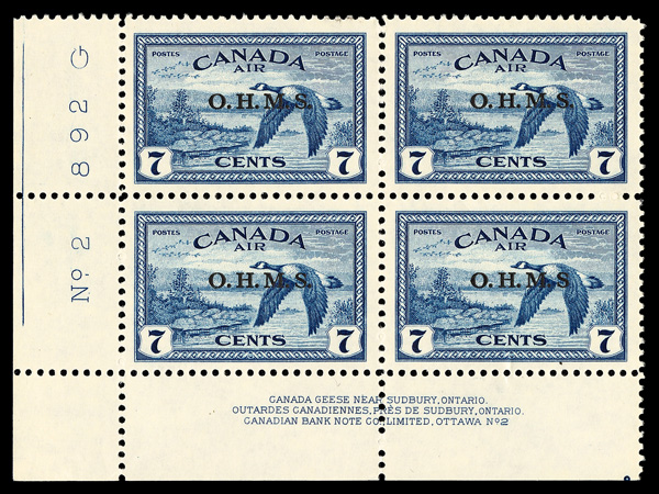 8468 nhbl CO1 imageAirmail Official, 1949, 7¢ deep blue, "O.H.M.S.", no period after 'S' (Scott CO1), plate block of 4, o.g., never hinged, Extremely Fine.