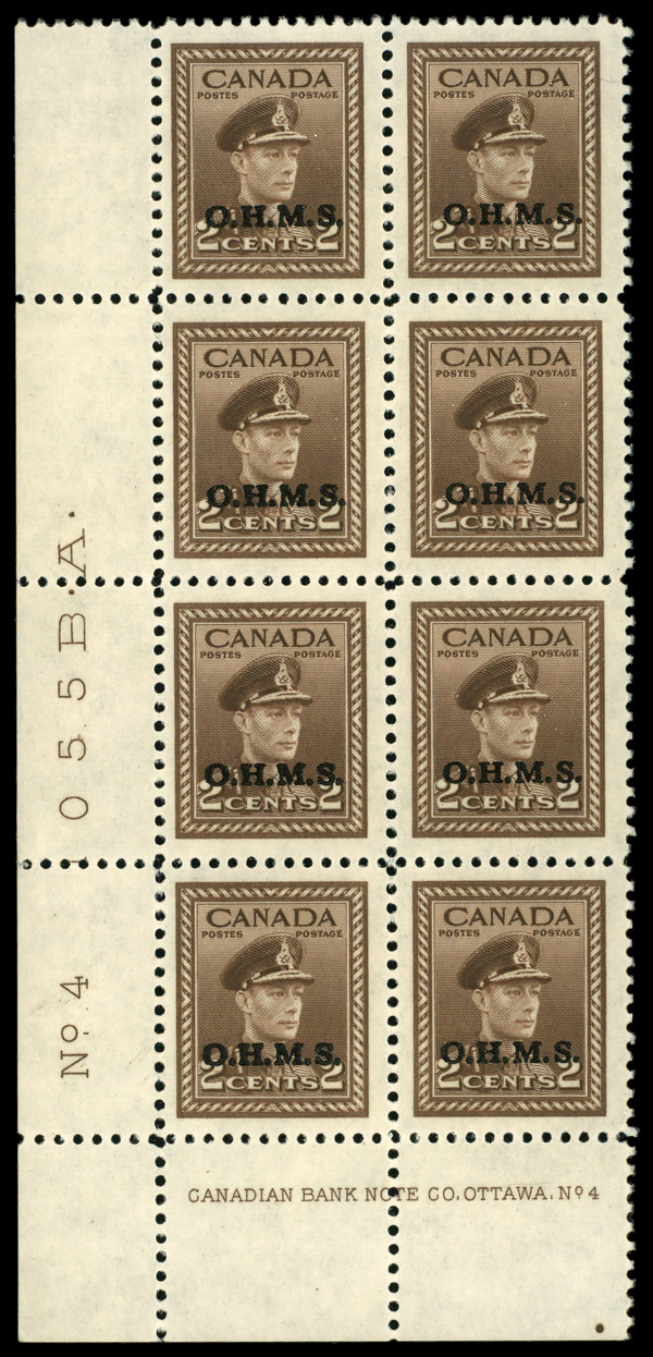 8475 nhbl O2 imageOfficial, 1949, 2¢ King George VI, "O.H.M.S." overprint (Unitrade O2), LL plate block of 8 plate #4, o.g., never hinged, Very Fine to Extremely Fine.
