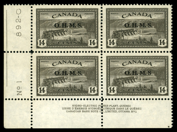 8476 nhbl O7a imageOfficial, 1949, 14¢ Hydroelectric Plant, "O.H.M.S." overprint, no period after "S" (Scott O7a), plate block of 4, variety on the LR stamp., o.g., never hinged, Extremely Fine.
