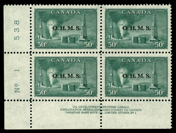 8478 nhbl O11 imageOfficial, 1950, 50¢ Oil Wells, "O.H.M.S." overprint (Scott O11), plate block of 4, o.g., never hinged, Superb.