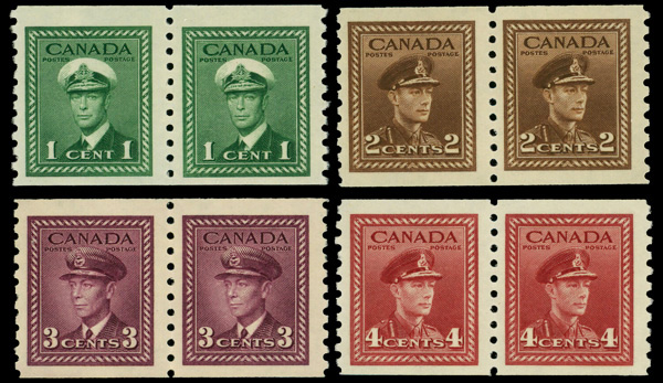 8458 nh 278-281 image1948, King George VI, horizontal coils, perf. 9½ vertically, 1¢ to 4¢ complete (Scott 278-281), set of 4, pairs, o.g., never hinged, Very Fine.