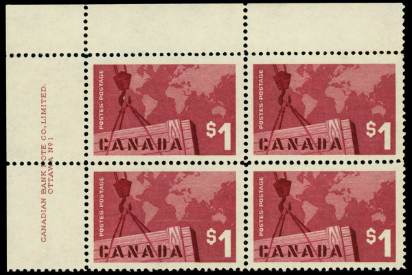 8460 nhbl 411 image1963, $1 Export (Scott 411), plate block of 4, o.g., never hinged, Very Fine to Extremely Fine.