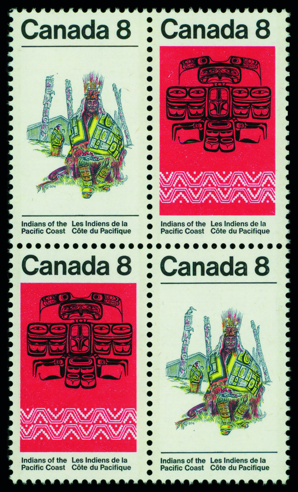 8461 nhbl 572a var image1974, 8c Pacific Coast Indians, 'Missing Bird on Totem' variety (Scott 572a var), block of 4, variety is UL stamp, o.g., never hinged, Extremely Fine.
