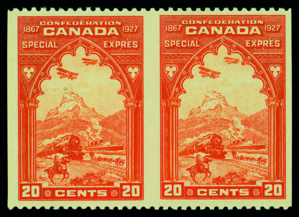 8469 nh E3b imageSpecial Delivery, 1927, Confederation, 20¢ orange, horizontal pair, imperf. vertically (Scott E3b), o.g., never hinged, Very Fine.