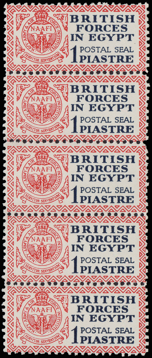 8540 O M1 image1932, "Postal Seal,", 1pi red & blue (Scott M1), vertical strip of 5, o.g., top stamps lightly hinged, rest never hinged, fresh and exceptionally well centered, Very Fine.