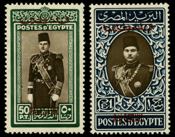 8542 nh N13-N14 image1948, 50pi-£1 King Farouk, 'PALESTINE' overprint, high values (Scott N13-N14), o.g., never hinged, Very Fine to Extremely Fine.