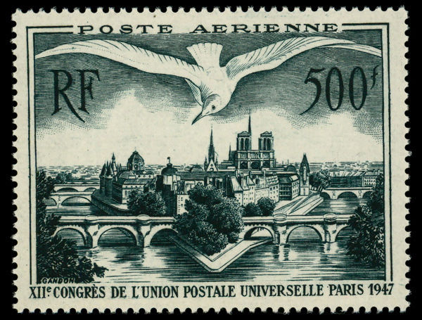 8550 nh C22 imageAirmail, 1947, 500fr U.P.U. Congress (Scott C22), o.g., never hinged, Extremely Fine.