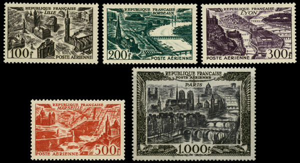 8551 nh C23-C27 imageAirmail, 1947, City Views, 100fr to 1,000fr complete (Scott C23-C27), set of 5, o.g., never hinged, Very Fine to Extremely Fine.