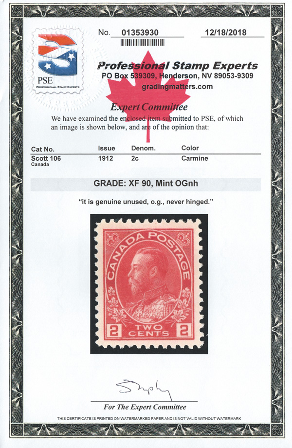 9560 nh 106 image1912, King George V "Admiral", 2¢ carmine (Scott 106), o.g., never hinged, bright, fresh and beautifully centered.