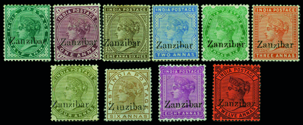 9545 og 12 image1895-96, "Zanzibar" overprinted in black on India 1r slate (Scott 12), single, o.g., hinge remnant (small album adherence), Fine to Very Fine.