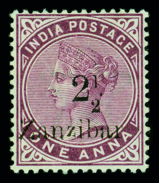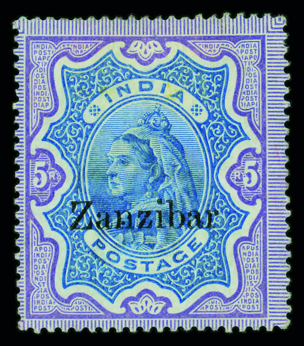9548 og 16 image1895-96, "Zanzibar" overprinted in black on India 5r ultramarine & violet (Scott 16), single, o.g., hinge remnant, Fine to Very Fine.