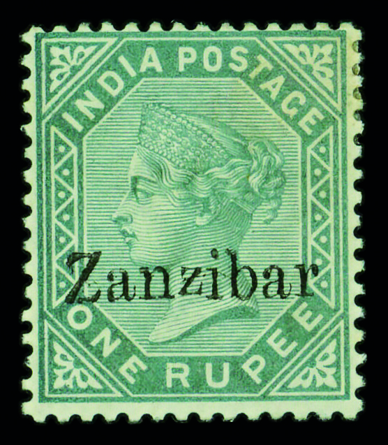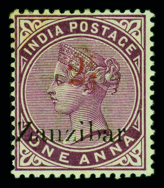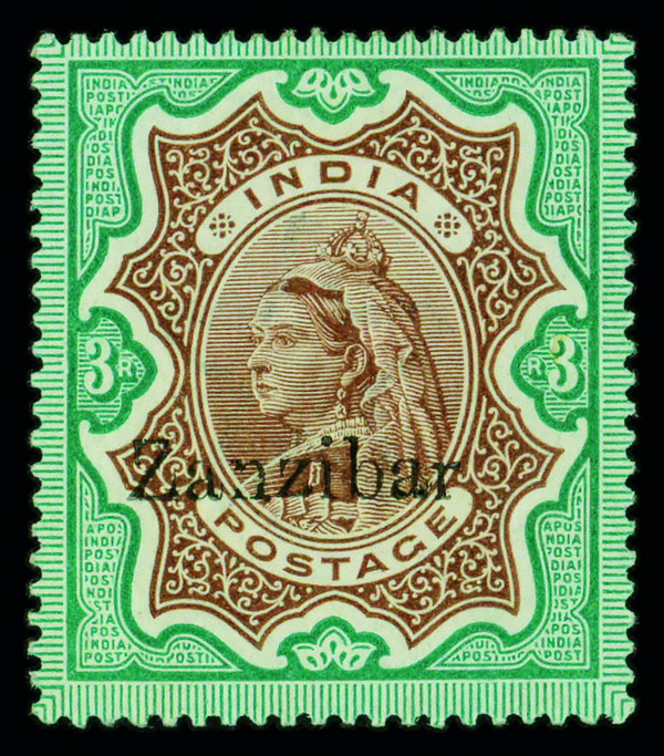 9547 og 15 image1895-96, "Zanzibar" overprinted in black on India 3r brown & green (Scott 15), single, o.g., lightly hinged, Fine to Very Fine.