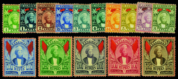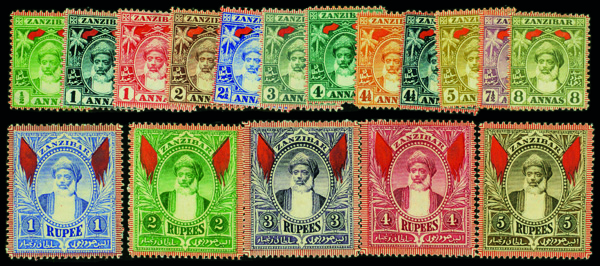 9553 og 38-52 image1896, Sultan Seyyid Hamed-bin-Thwain, ½a to 5r complete (Scott 38-52), Rosette watermark, complete set of singles, o.g., hinge remnant, Fine to Very Fine.