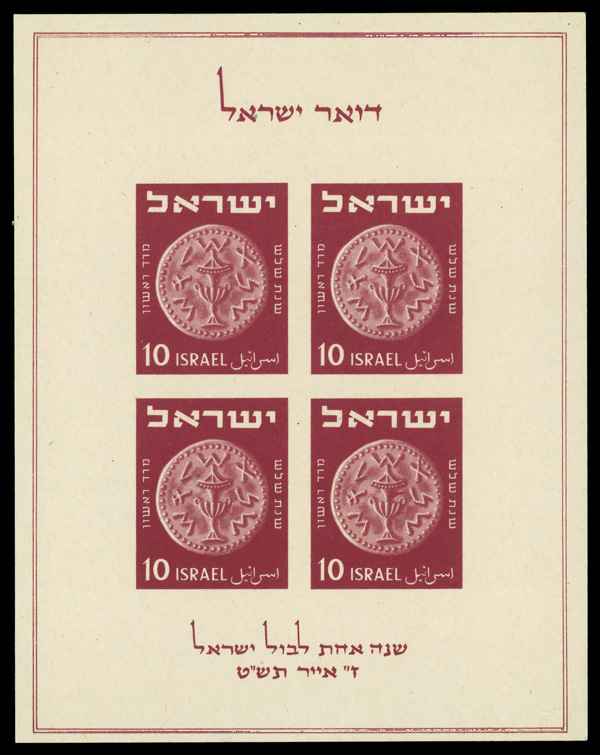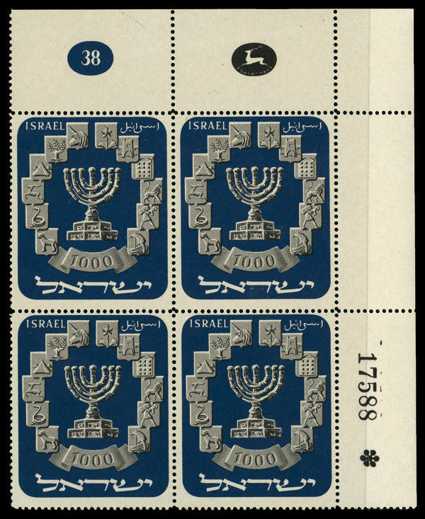 9575 nhbl 55 image1952, 1000p Menorah (Scott 55), plate block of 4, o.g., never hinged, Very Fine.