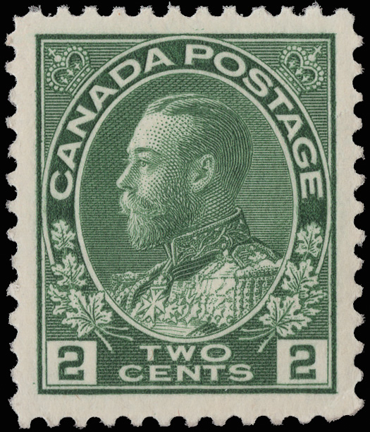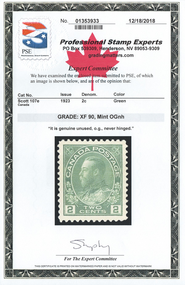 9561 nh 107e image1923, King George V "Admiral", 2¢ green, dry printing (Scott 107e), o.g., never hinged, fresh and virtually perfectly centered, Extremely Fine, with a 2018 P.S.E. certificate graded XF 90.