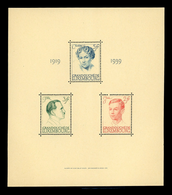9576 nh 217 image1939, Reign Anniversary of Grand Duchess Charlotte, souvenir sheet of 3 (Scott 217), o.g., never hinged, Extremely Fine.