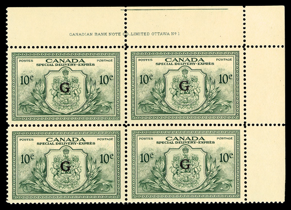 9567 nhbl EO2 imageSpecial Delivery Official, 1950, 10¢ green, "G" (Scott EO2), plate block of 4, o.g., never hinged, Extremely Fine to Superb.