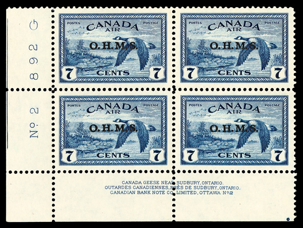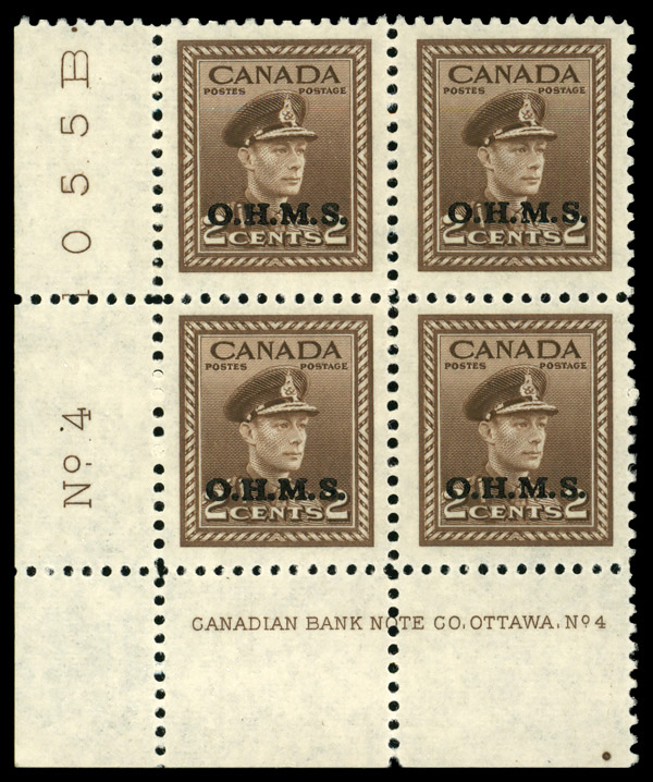 9569 nhbl O2 imageOfficial, 1949, 2¢ King George VI, "O.H.M.S." overprint (Unitrade O2), LL plate block of 4 plate #4, o.g., never hinged, Extremely Fine.