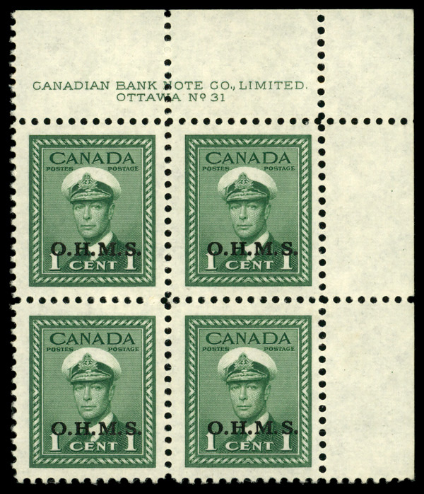 9568 nhbl O1 imageOfficial, 1949, 1¢ King George VI, "O.H.M.S." overprint (Unitrade O1), UR plate block of 4 plate #31, o.g., never hinged, Extremely Fine.