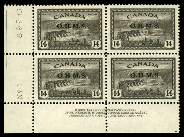 9570 nhbl O7a imageOfficial, 1949, 14¢ Hydroelectric Plant, "O.H.M.S." overprint, no period after "S" (Scott O7a), plate block of 4, variety on the LR stamp., o.g., never hinged, Extremely Fine to Superb.