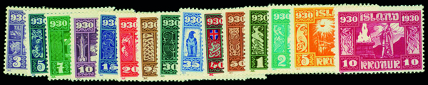 9573 og 152-166 image1930, Parliament Millennium regular issues, 3a to 10kr complete (Scott 152-166), complete set of singles, o.g., hinge remnant, Fine to Very Fine.