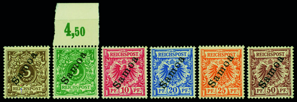 9578 nh/og 51-56 image1900, 3pf-50pf overprinted complete (Scott 51-56), complete set of singles, Scott 51 and 52 are mint never hinged, Scott 54 and 55 are mint lightly hinged., o.g., lightly or remnant hinged (2 stamps never hinged), Very Fine.