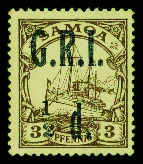 9579 og 101 image1914, G.R.I. ½d on German Samoa 3pf brown (Scott 101), single, o.g., hinge remnant, Very Fine.