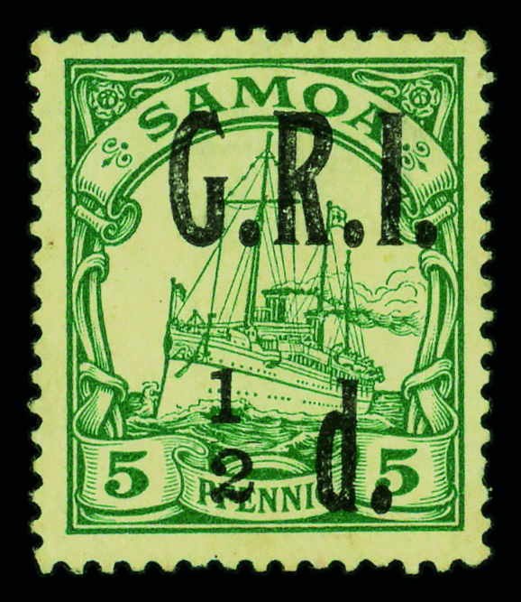 9580 og 102 image1914, G.R.I. ½d on German Samoa 5pf green (Scott 102), single, o.g., lightly hinged, Very Fine.