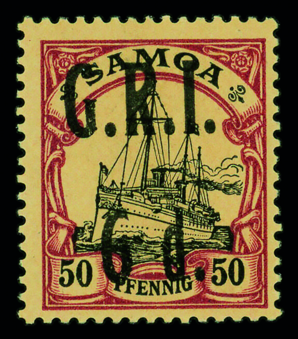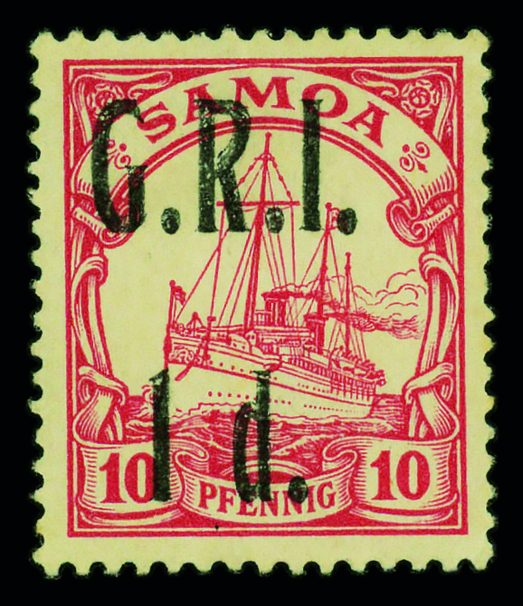 9581 og 103 image1914, G.R.I. 1d on German Samoa 10pf carmine (Scott 103), single, o.g., small hinge remnant, Very Fine.