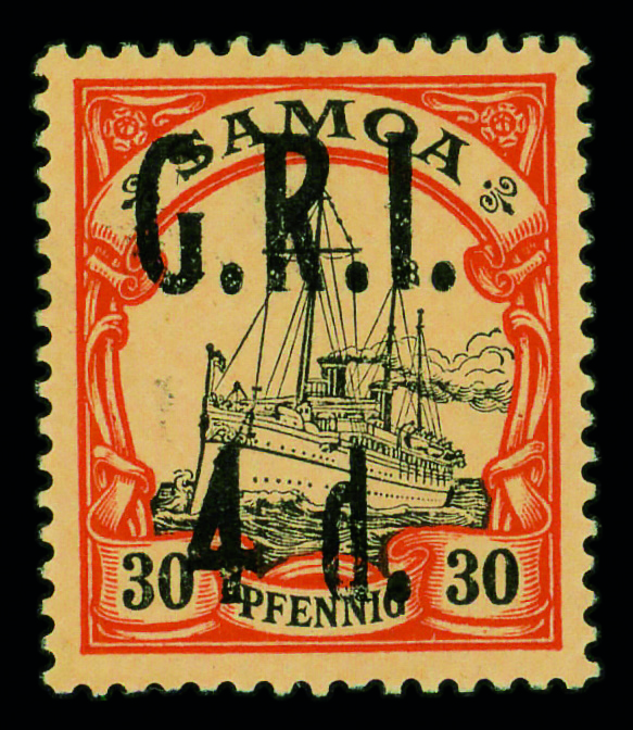 9585 og 106 image1914, G.R.I. 4d on German Samoa 30pf black & orange on buff (Scott 106), single, o.g., hinge remnant, Very Fine.