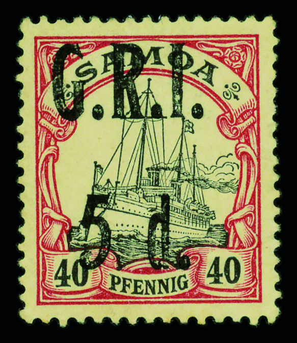9586 og 107 image1914, G.R.I. 5d on German Samoa 40pf black & carmine (Scott 107), single, o.g., small hinge remnant, Very Fine.