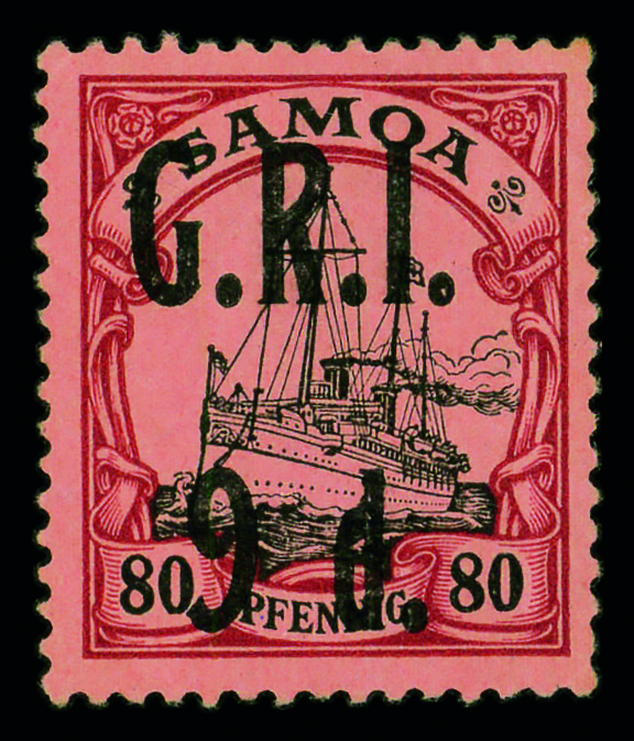 9588 og 109 image1914, G.R.I. 9d on German Samoa 80pf black & carmine on rose (Scott 109), single, o.g., hinge remnant, Very Fine.