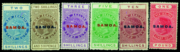 9589 og 120-125 image1918, 2s-£1 overprinted New Zealand Postal-Fiscals (Scott 120-125), singles, o.g., lightly hinged or hinge remnant, Fine to Very Fine.